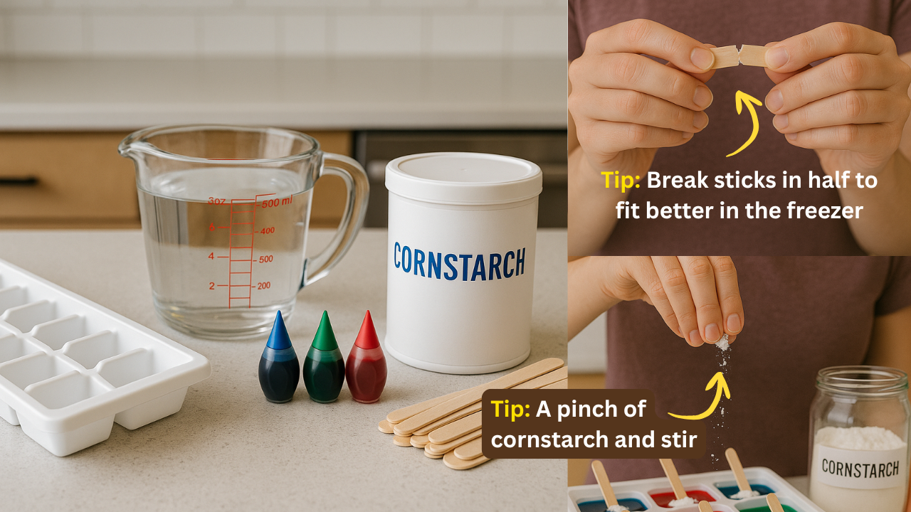 Make your paint cubes. Fill the tray with water and stir in a few drops of food coloring per cube. If you want bolder colors, go generous. Add a craft stick into each section and freeze solid—overnight is best.